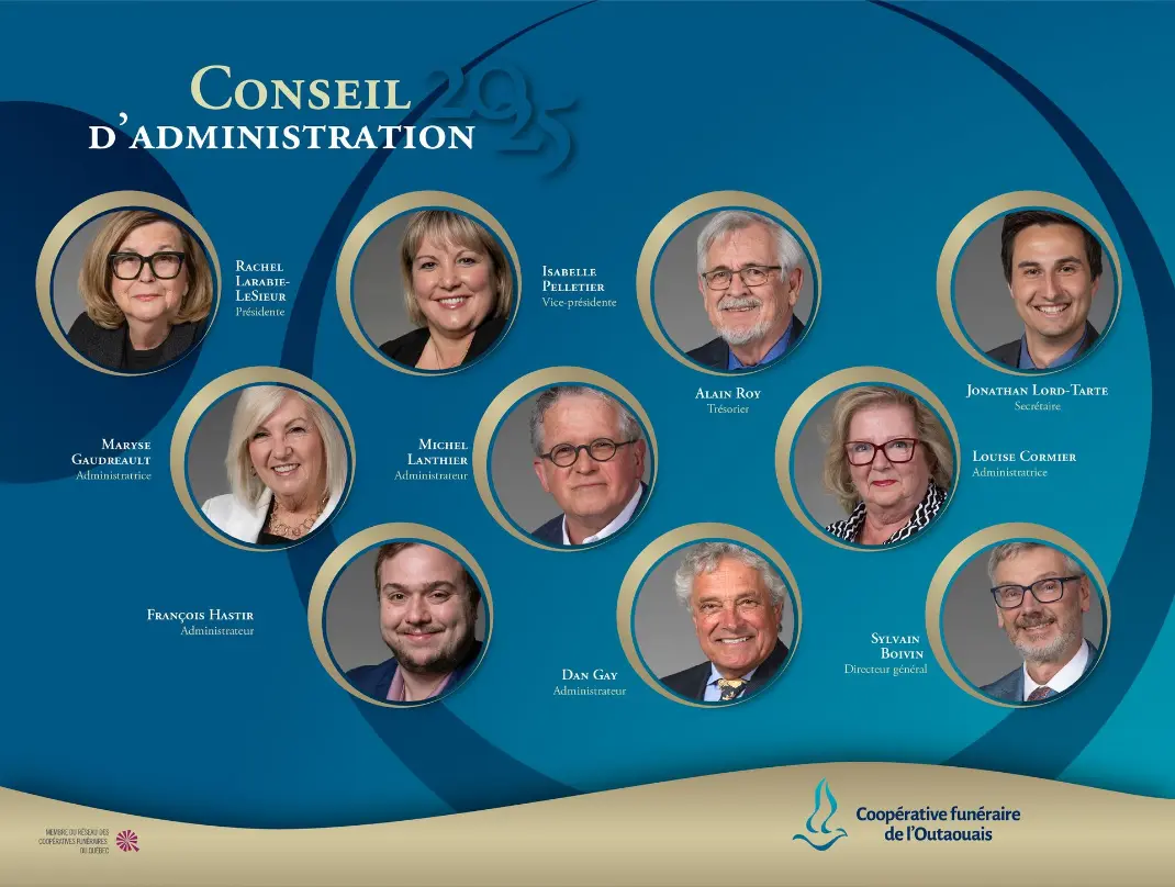 Elected at the most recent Annual General Meeting held on April 24, the Board is composed of: Rachel Larabie Lesieur, President Isabelle Pelletier, Vice-President Alain Roy, Treasurer Jonathan Lord-Tarte, Secretary Dan Gay, Director Maryse Gaudreault, Director François Hastir, Director Louise Cormier, Director Michel Lanthier, Director Sylvain Boivin, General Manager — liaison to the Board
